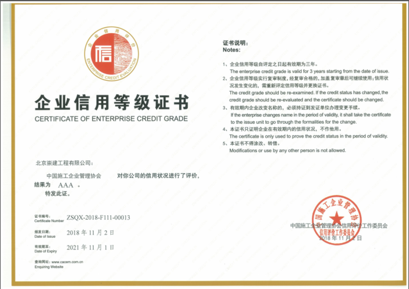 北京崇建公司被評定為2020年度工程建設企業社會信用AAA等級