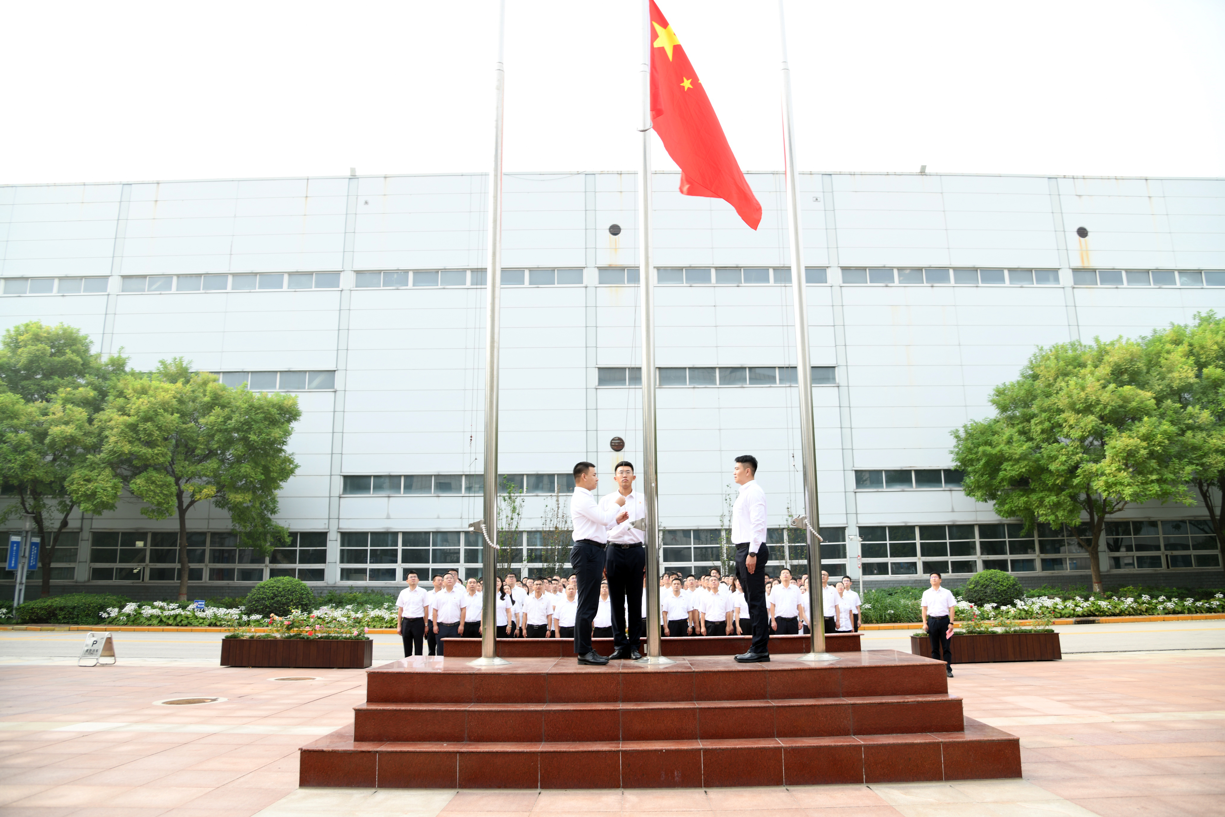 晨曦之中,重工大樓門(mén)前氣氛肅穆。兩公司全體員工整齊列隊(duì),注視國(guó)旗護(hù)衛(wèi)隊(duì)邁著鏗鏘步伐走向升旗臺(tái)。在雄壯的國(guó)歌聲中,鮮艷的五星紅旗冉冉升起。全體員工肅立行注目禮,胸中激蕩著對(duì)偉大祖國(guó)的崇高敬意。