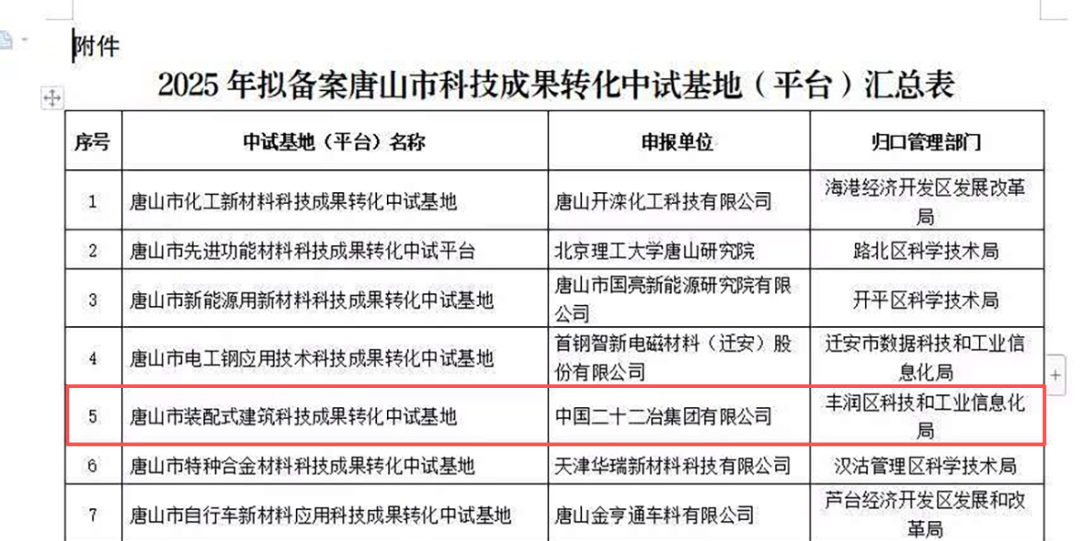 近日,經唐山市科學技術局審核與公示,由裝配式公司牽頭申報的“唐山市裝配式建筑科技成果轉化中試基地”成功入選2025年度唐山市科技成果轉化中試基地示范(平臺),標志著公司在裝配式建筑領域的科研實力與成果轉化能力獲得市級認可與支持。